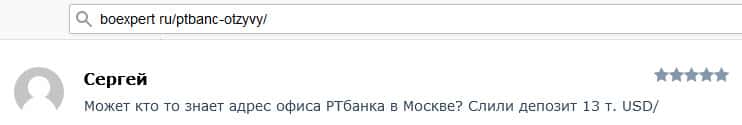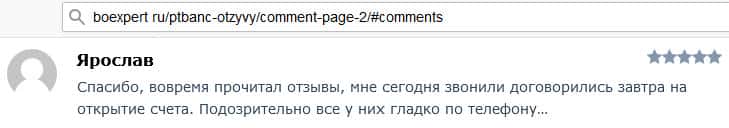 Все-таки, что не говори, а отзывы и массовый справедливый негатив в сети делает свое дело. Человек, прочитав подробные отзывы о шараге ПТ Банк, решил не нести туда свои кровно заработанные деньги. И сделал правильный выбор, потому что жуликам их доверять нельзя ни в коем случае, они вас кинут.