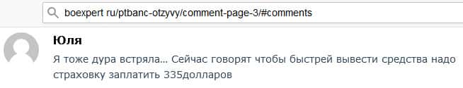 500 долларов, конечно, в наше время сложно назвать легким испугом, но все же это не десятки тысяч, как у некоторых. Даже меньшие суммы служат этакой лакмусовой бумажкой того, что не стоит связываться с жуликами PT Banc, они все равно вас рано или поздно обманут. Бывают случаи, когда люди продают квартиры, чтобы вложиться в такие лохотроны и последствия этому очень печальные.