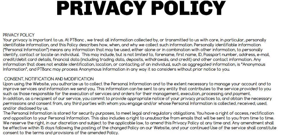 Политика конфиденциальности мошенников PT Banc не дает также никаких гарантий того, что в последствии ваши персональные данные не будут переданы третьим лицам. Скорее всего, они потом продадут ваши контакты не одному, а нескольким людям, которые будут вас донимать разного рода "выгодными предложениями".