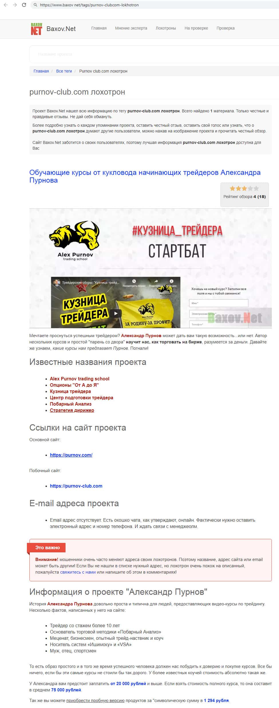 Так же сайт baxov net усомнился в конторе Purnov-Club. Интернет ресурс утверждает, что компания создала образ "успешного" человека, который должен заставить пользователей инвестировать в лохотрон.
