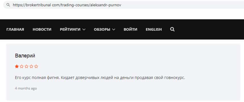 Интернет ресурс brokertribunal com высказался по поводу компании кидал Purnov-Club. Сайт утверждает, что это мошенническая контора, которая продаёт бесполезные курсы.