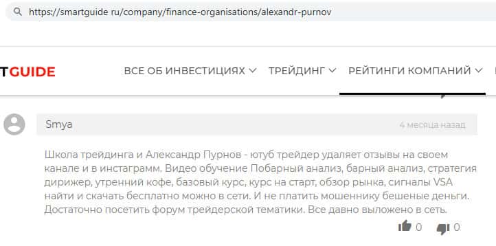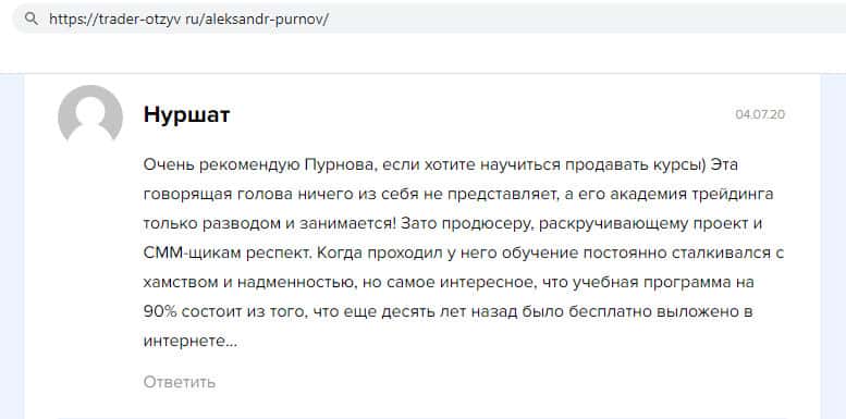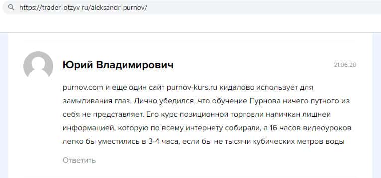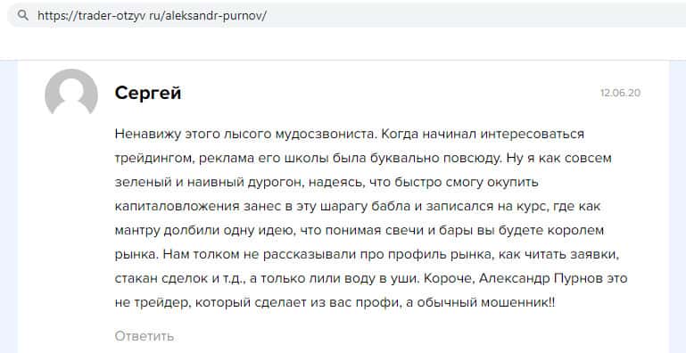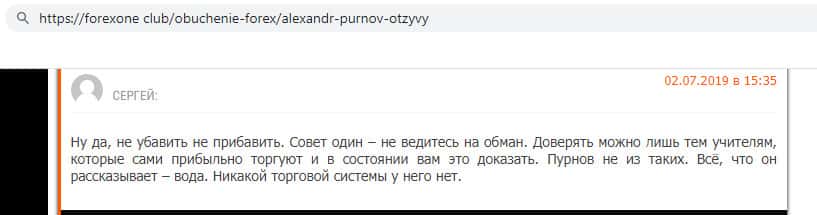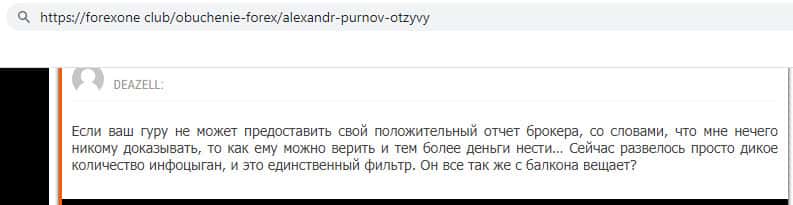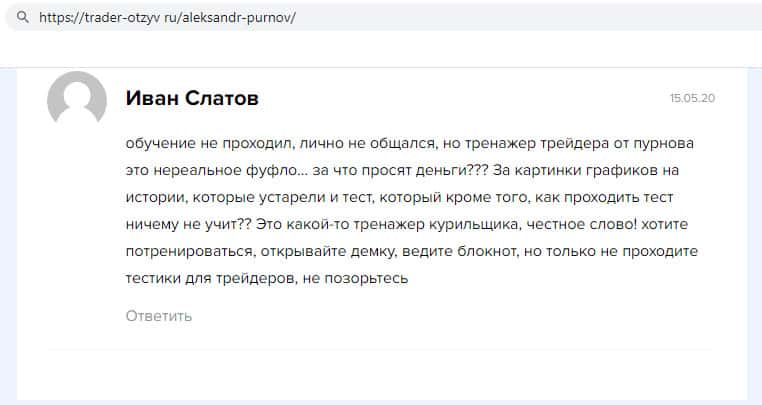 Вот ещё один пользователь сообщил, что данному лохотрону Purnov-Club нельзя верить. так как нет доказательств того, что тренер сам умеет торговать.