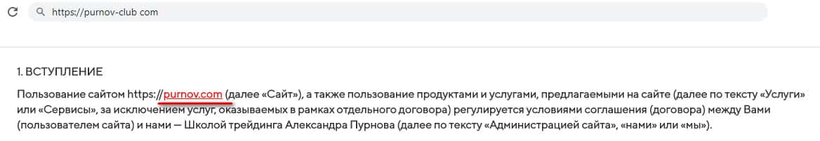 В своём соглашении компания мошенников Purnov-Club почему то ссылается на второй свой сайт "pernov com", хотя соглашение находится на основном интернет ресурсе.