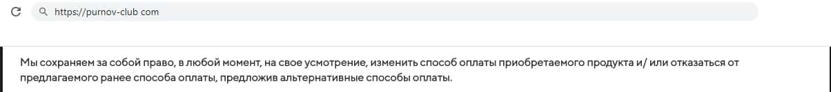 По мимо этого в соглашении аферистов Purnov-Club есть другие подозрительные пункты, например жулики указали, что могут на своё усмотрение изменять способы оплаты своих услуг.