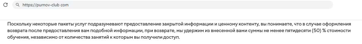 Мошенники Purnov-Club так же указали, что если клиент захочет вернуть свои средства, то компания удерживает себе половину средств в качестве компенсации за услуги.