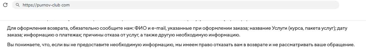 Так же кидалы Пурнов Клуб для возврата средств клиенту требуют от него полный пакет личной информации, и если он не предоставит свои данный, то возврата никакого не будет.