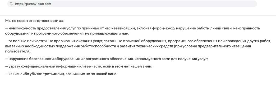 Махинаторы Purnov-Club так же указали, что не несут ответственность за невозможность предоставление услуг а так же за утрату конфиденциальной информации клиентов.