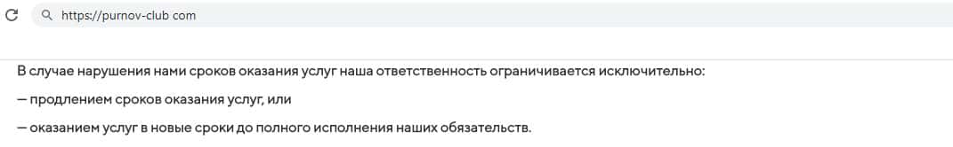 Мошенническая организация Purnov-Club указала, что если она нарушает сроки оказания услуг, то всего лишь перенесёт дату их предоставления и не более.