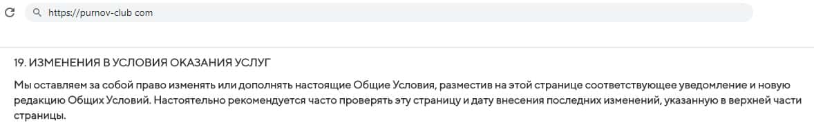 Компания финансовых разводил Purnov-Club так же оставила за собой право в любой момент изменять условия данного соглашения, и пользователи обязаны постоянно проверять его.
