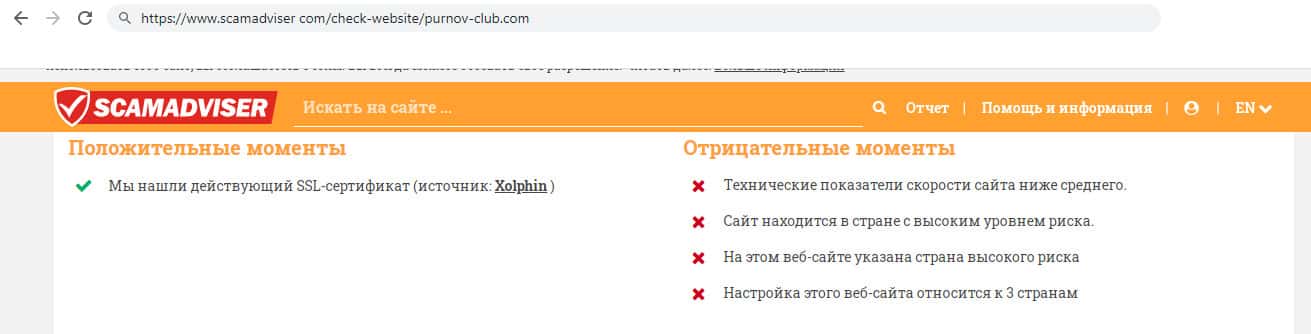 Интернет ресурс scamadviser com отметил положительные и отрицательные стороны компании Пурнов Клуб. Положительных очень мало. в то время как отрицательных нашлось довольно не мало.