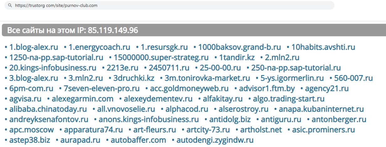 С помощью сайта "Доверие в Сети" мы проверили какие какие сайты используют один айпи с мошенниками Пурнов Клуб. Оказывается на одном айпи с лохотроном существует очень много сайтов.