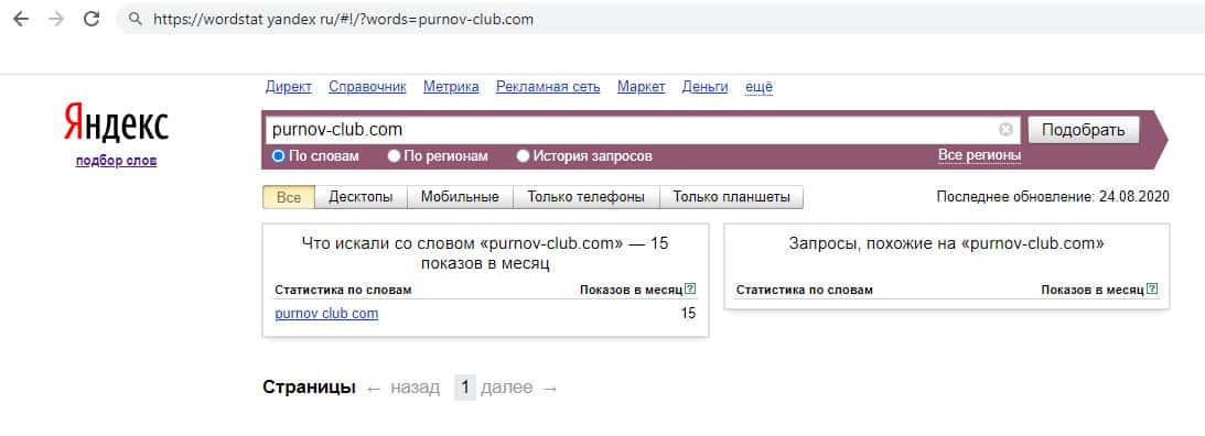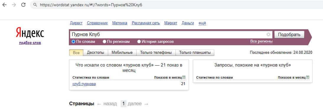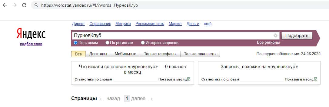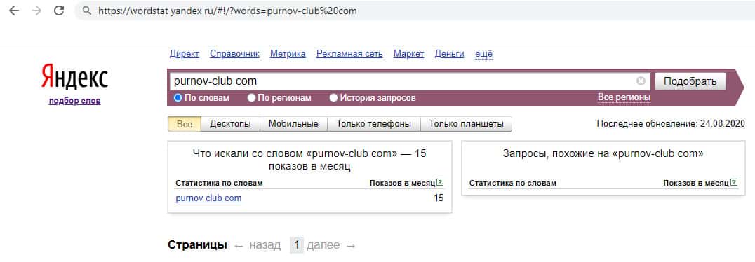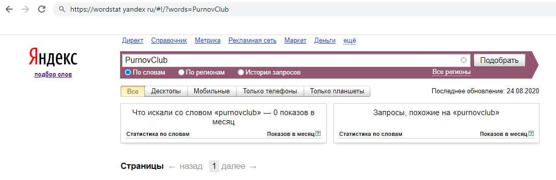 Ещё мы проверили количество запросов фирмы кидал Пурнов Клуб по русскоязычному названию без пробела, а именно "ПурновКлуб". Но результат никакого не оказалось.