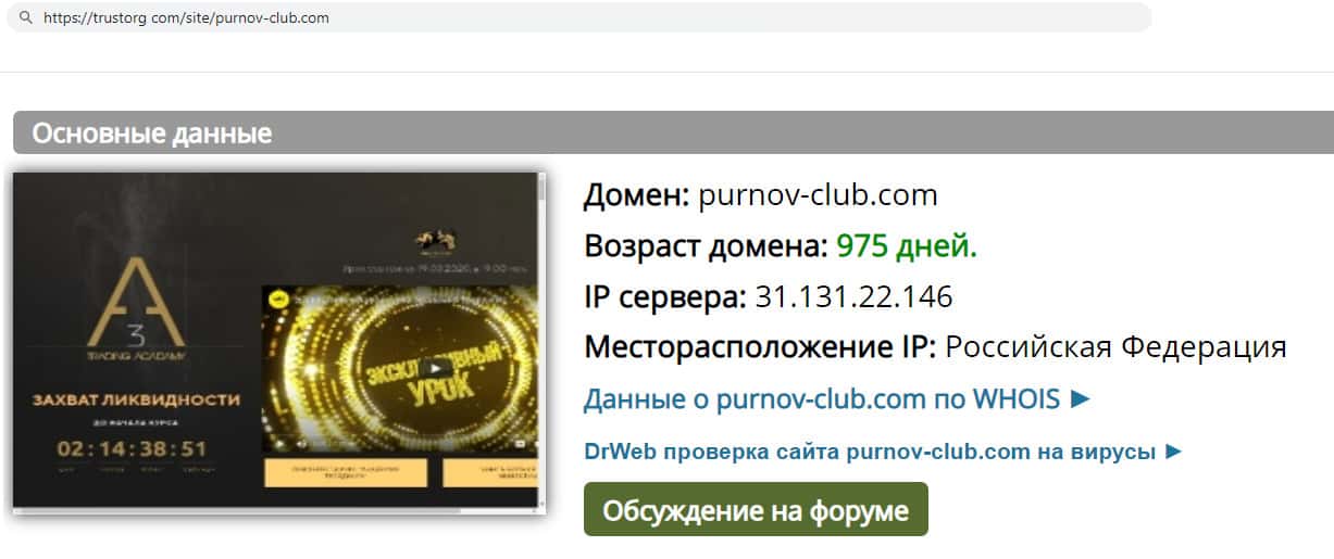 Мы проверили возраст компании аферистов purnov-club com через интернет ресурс "Доверие в Сети". Оказалось, что конторе более двух лет, это говорит о том, что компания развела очень много пользователей.