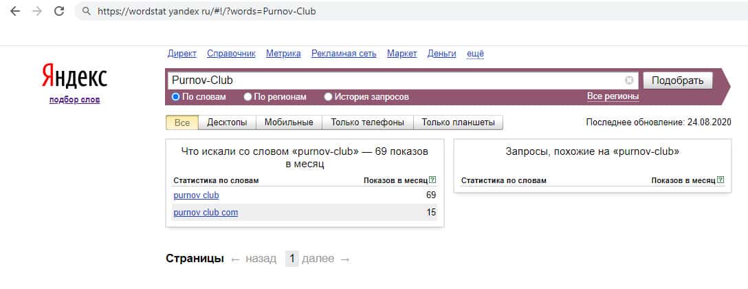Мы проверили количество запросов компании Purnov-Club в Яндексе по названию фирмы, а именно "Purnov-Club". 69 раз пользователи выполняли данный запрос в течении месяца.