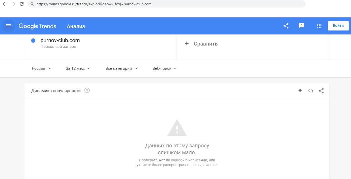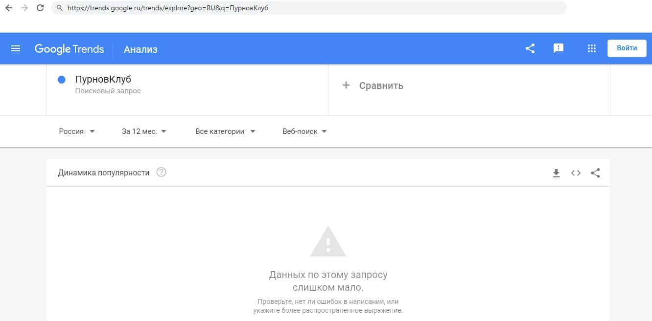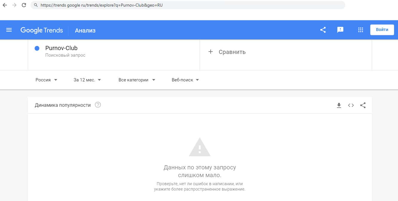 Мы решили проверить количество запросов компании финансовых кидал Purnov-Club в Гугле по названию конторы, а именно "Purnov-Club". Оказалось, что пользователи не выполняли данный запрос.