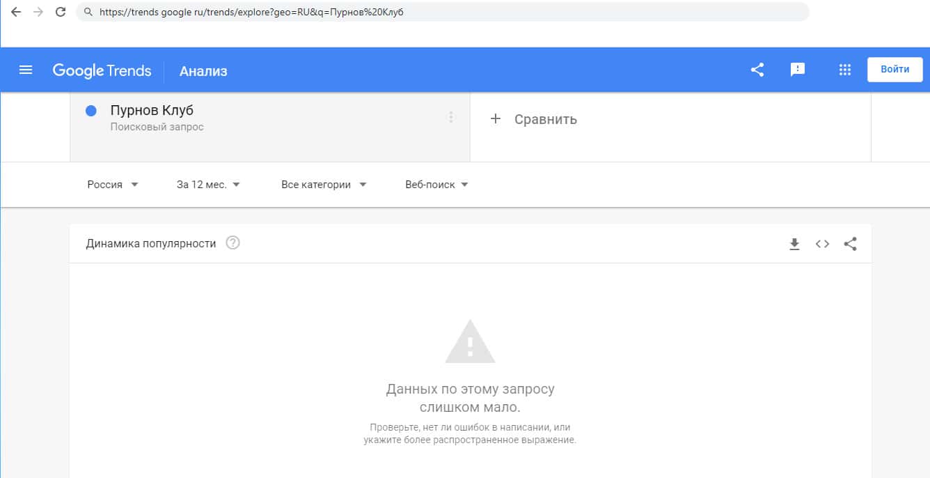 Так же мы проверили количество запросов лохотрона Purnov-Club по русскоязычному названию компании, а именно "Пурнов Клуб". Но этот запрос так же пользователи не выполняли.