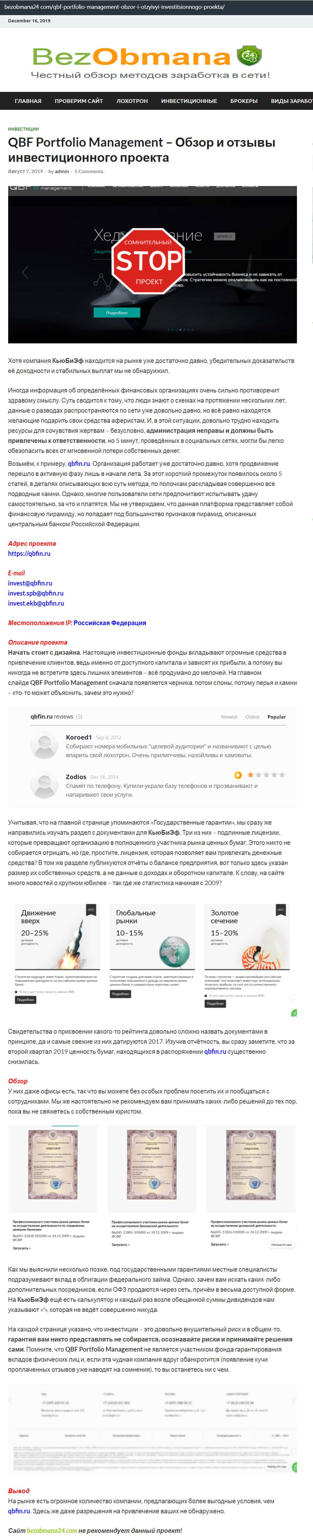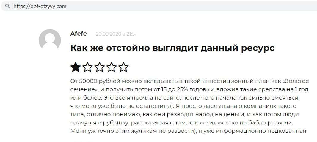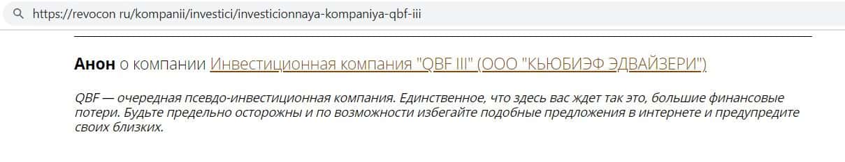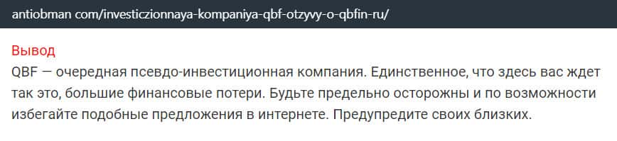 Информационный-ресурс Антиобман Ком причислил QBF к числу псевдо-инвестиционных компаний. На публикации ниже предлагаем ознакомится с заключением по конторе QB Fin на сайте-разоблачителе Антиобман Ком, где организацию КьюБиФин определили просто как псевдо-проект, не имеющий абсолютно никакого отношения к сфере инвестиционного управления на реальных финансовых рынках.
