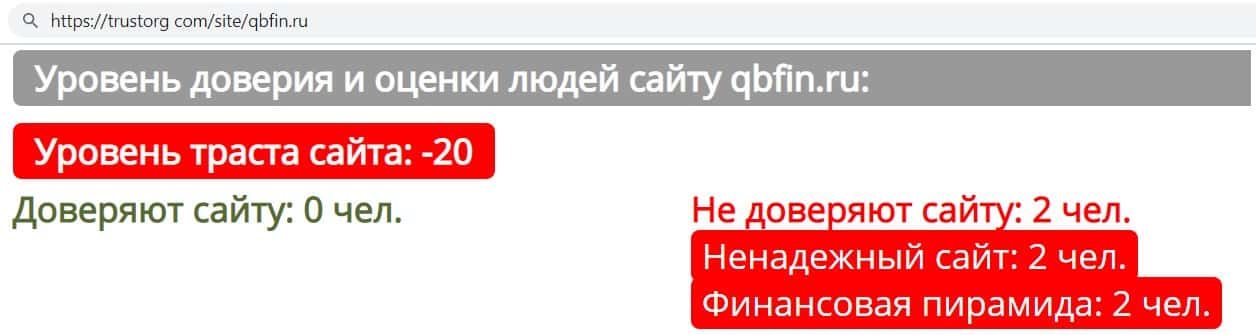 По данным сайта "Доверие в Сети" - мошенническая организация QB Fin имеет отрицательный уровень доверия клиентов, что говорит о плохой репутации компании.