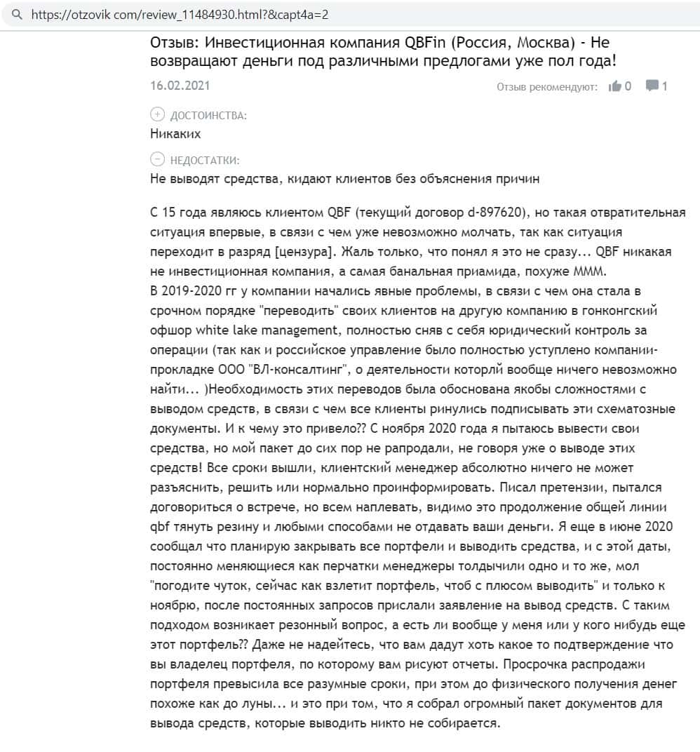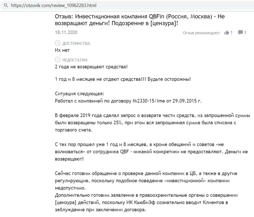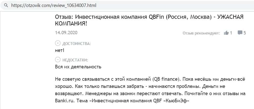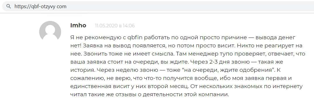 Автор отзыва сообщил, что компания кидал Кью Б Фин легко принимает средства, но никогда не выводит их, в добавок фирма ещё игнорирует клиентов и не отвечает на звонки.