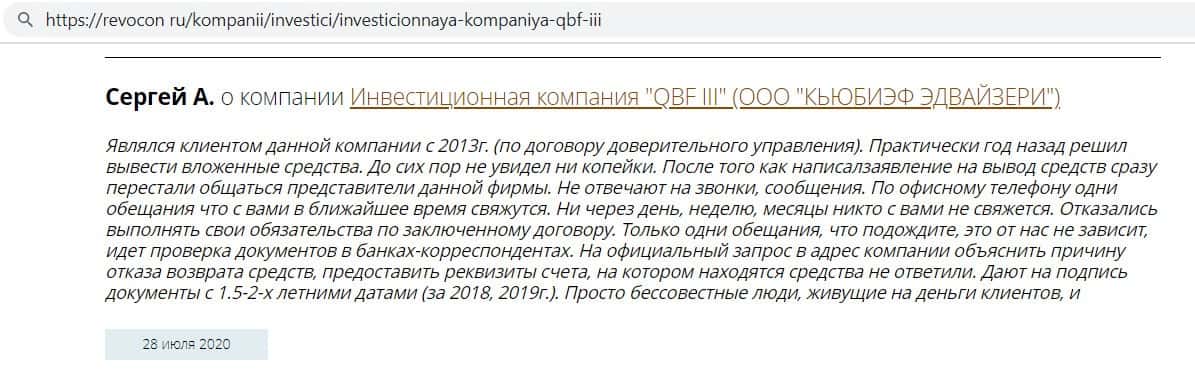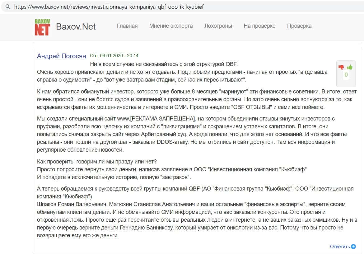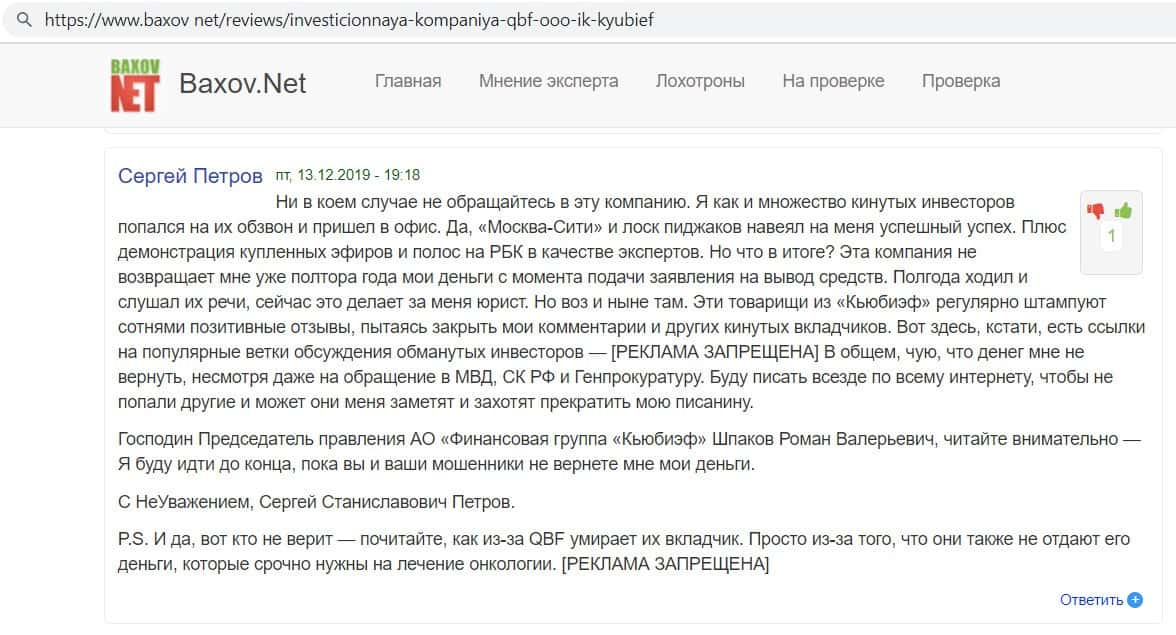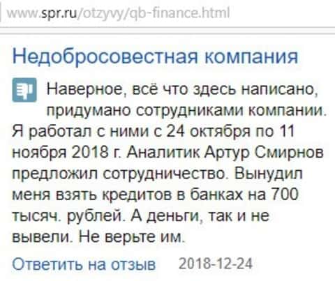 Человек, в противовес множеству фальшивых отзывов о конторе Кью Б Фин, оставил свой реальный отзыв, как аферисты опрокинули его на деньги. Аналитик Артур Смирнов предложил с ним сотрудничать, только для этого нужно было 700 000 рублей. Контора, получив деньги, перестала звонить своей жертве, а все запросы на вывод она отвергала.