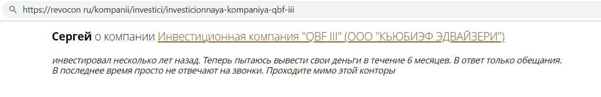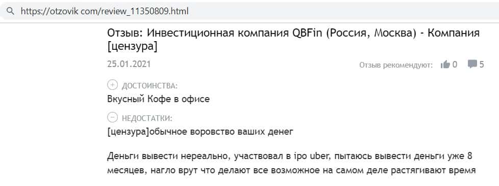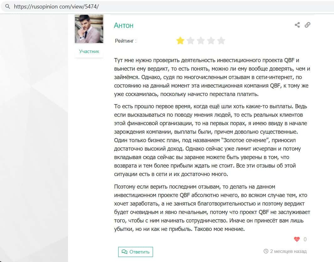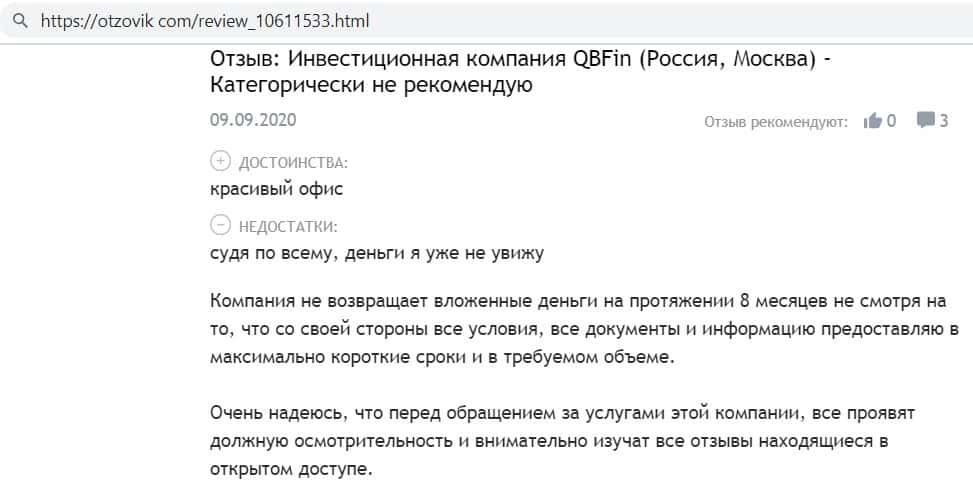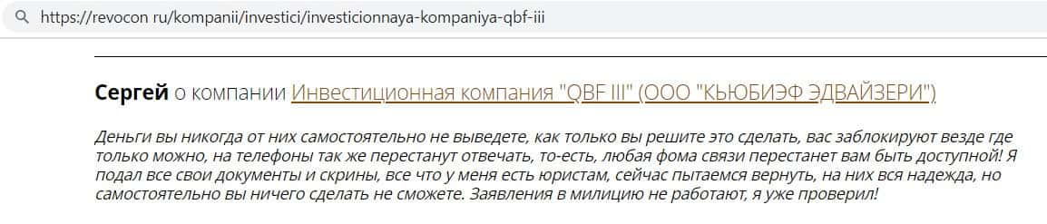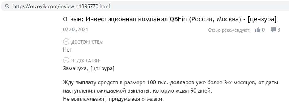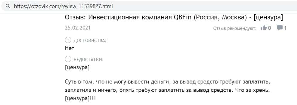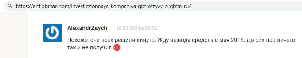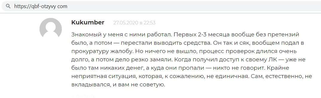 Автор отзыва написал, что инвестировал средства в фирму кидал QB Fin и всё было хорошо, даже начислялись проценты, но как только он решил вывести средства - ему отказали.