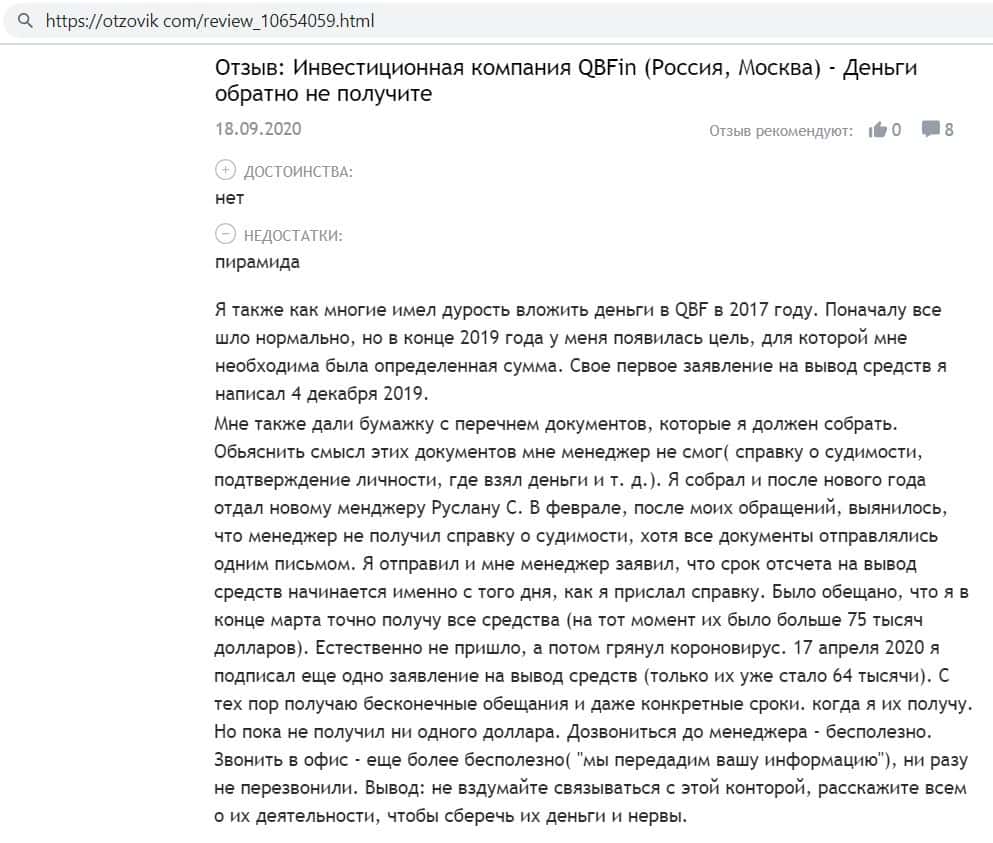 Автор данного отзыва написал, что уже восемь месяцев не может вывести средства из компании финансовых лохотронщиков QB Fin, несмотря на то, что выполнил все условия.