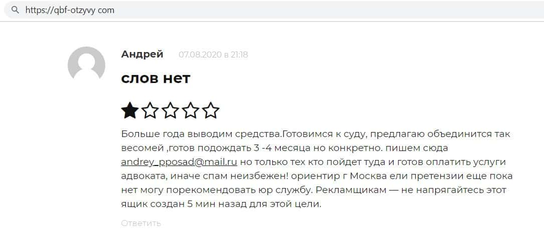 Ещё один пользователь сообщил, что пострадал от рук мошенников QB Fin, так как он уже полтора года не может вывести свои средства, несмотря на то, что делает это с юристом.