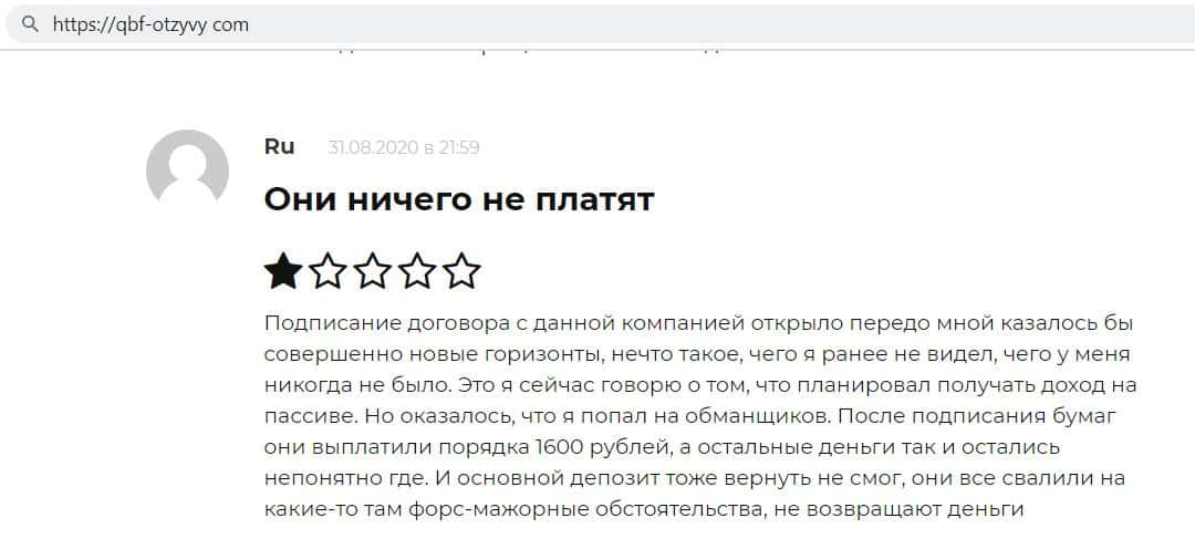 Автор отзыва написал, что когда начал сотрудничать с Кью Б Фин, думал, что будет получать большой доход, но фирма выплатила ему 1600 рублей, а остальные деньги слила.