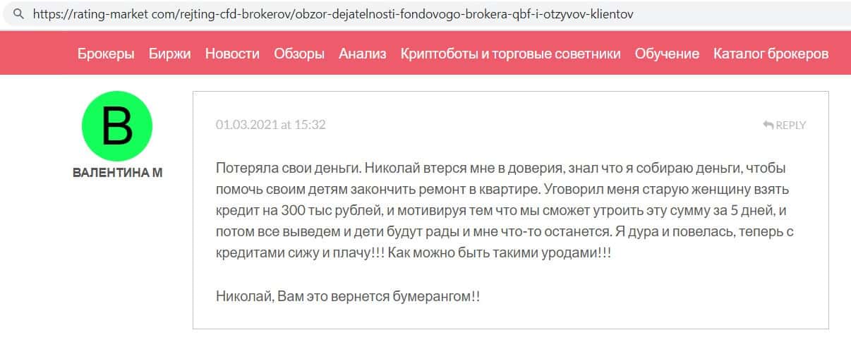 Пользователь в своём отзыве призвал всех не доверять конторе QB Fin, так как они принимают от клиентов очень много денежных средств, но никогда не выводят их.