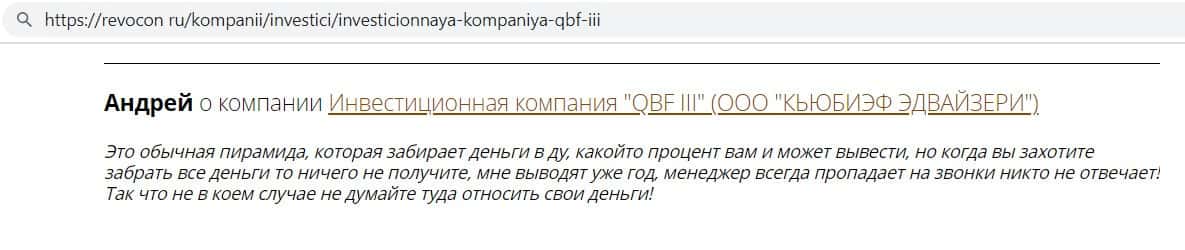 Пользователь написал, что контора Кью Б Фин является простой пирамидой, которая может вывести малую долю инвестированных средств, но всю сумму контора никогда не выведет.