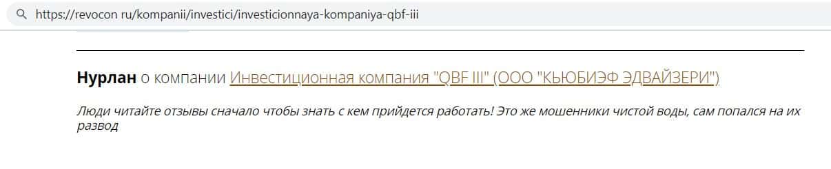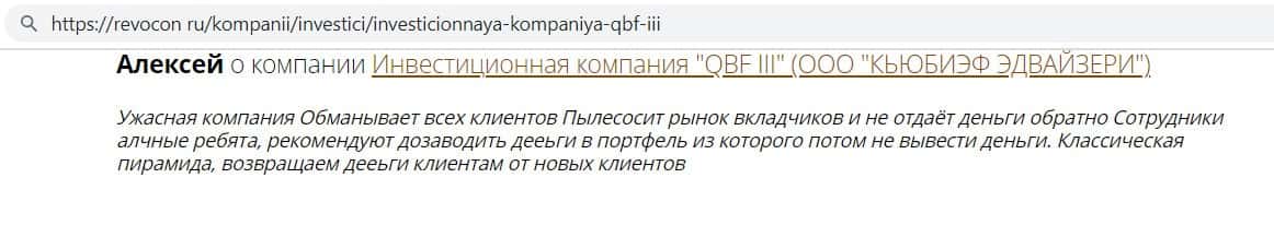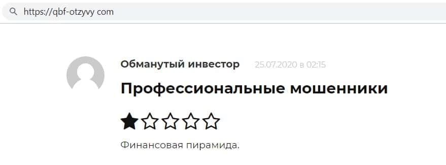 Автор данного отзыва написал, что сотрудничал с Кью Б Фин с 2015 года, но только недавно понял, что это не инвестиционная компания. а обыкновенная финансовая пирамида.