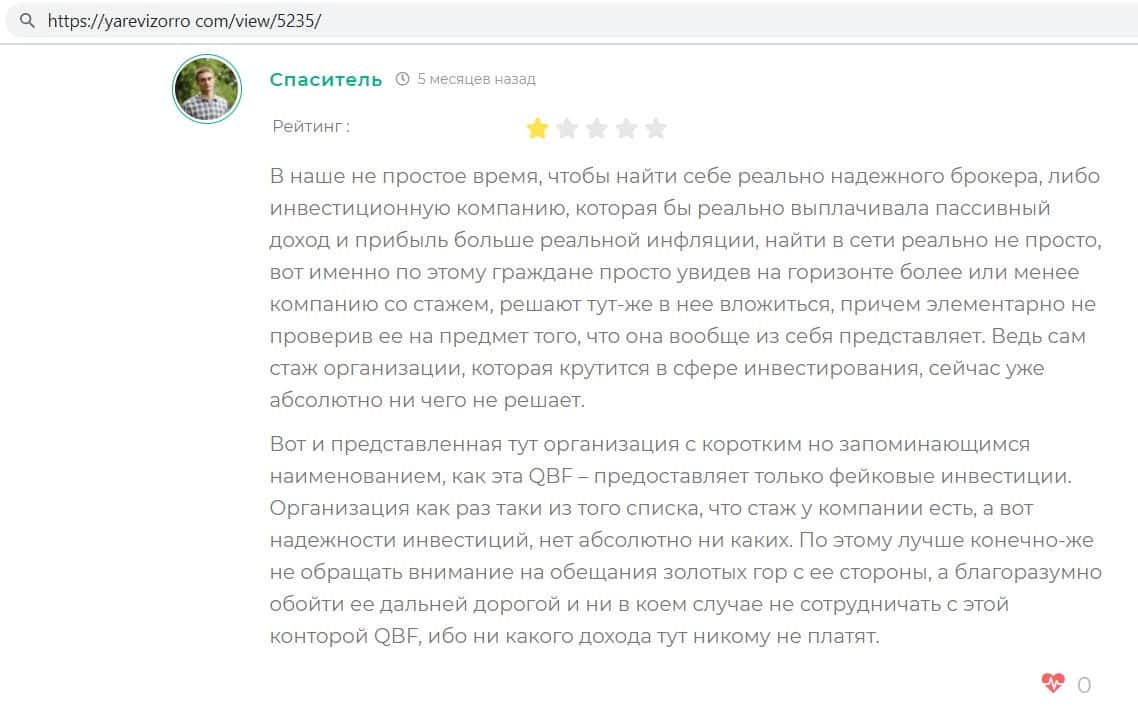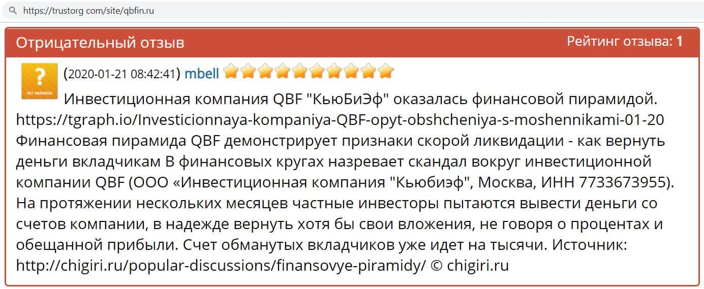 Очередной пользователь написал в своём отзыве о конторе QB Fin. что данная организация является финансовой пирамидой, так как все факторы указывают именно на это.