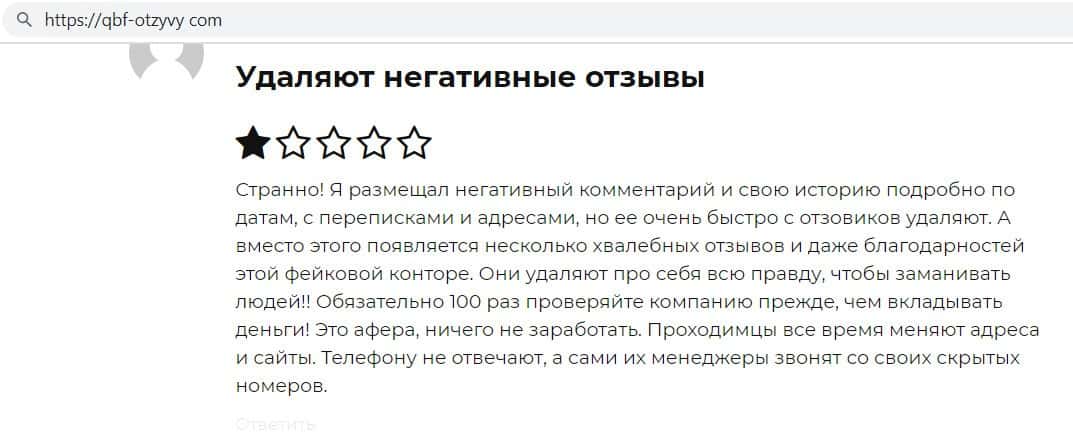 Автор данного отзыва написал, что написал о фирме QB Fin негативный отзыв, но спустя какое то время этот отзыв удалили, а вместо него появились 2 положительных отзыва.