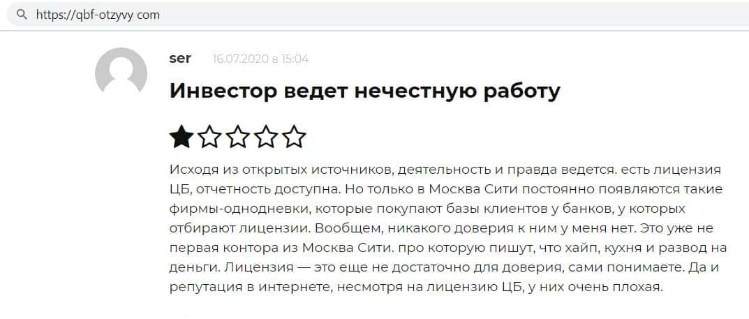 Очередной пользователь написал, что в сети очень трудно найти хорошую инвестиционную компанию, а фирма Кью Б Фин относится к разряду мошеннических, так как они не платят.