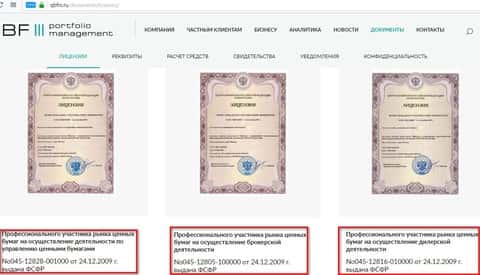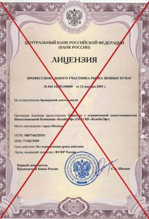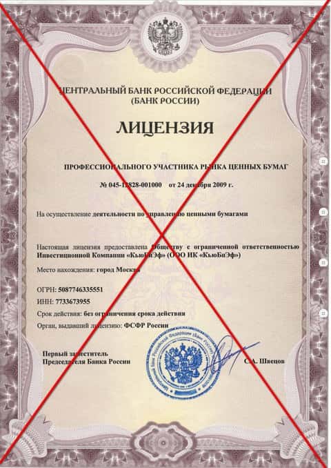 Ниже представлена приобретенная за деньги лицензия конторы Кью Б Фин на осуществление деятельности по управлению ценными бумагами No045-12828-001000 от 24.12.2009 г. выдана ФСФР.