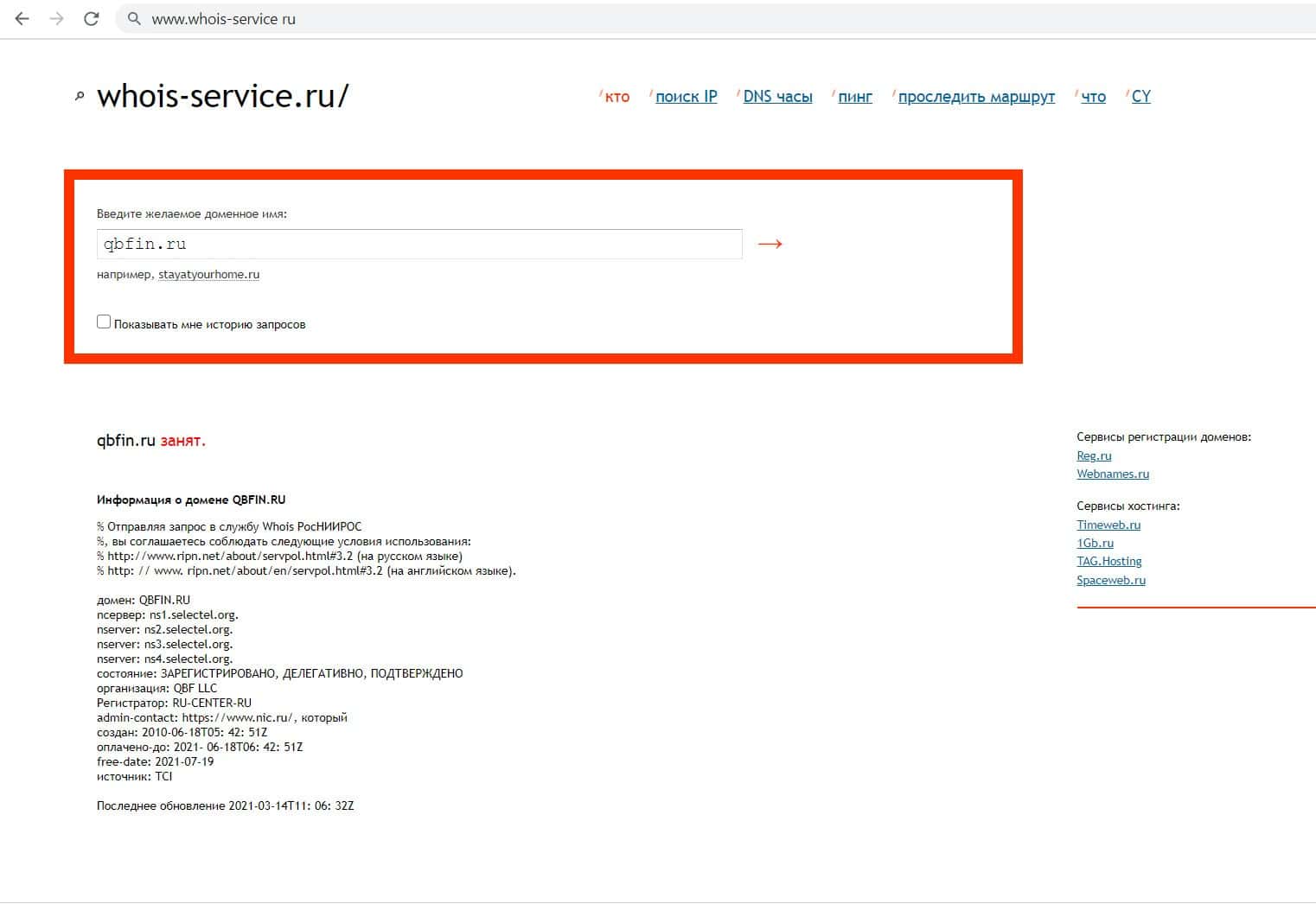 С помощью сайта whois-service ru мы решили узнать владельца домена конторы кидал Кью Б Фин, но оказалось, что мошенническая организация скрывает данную информацию.