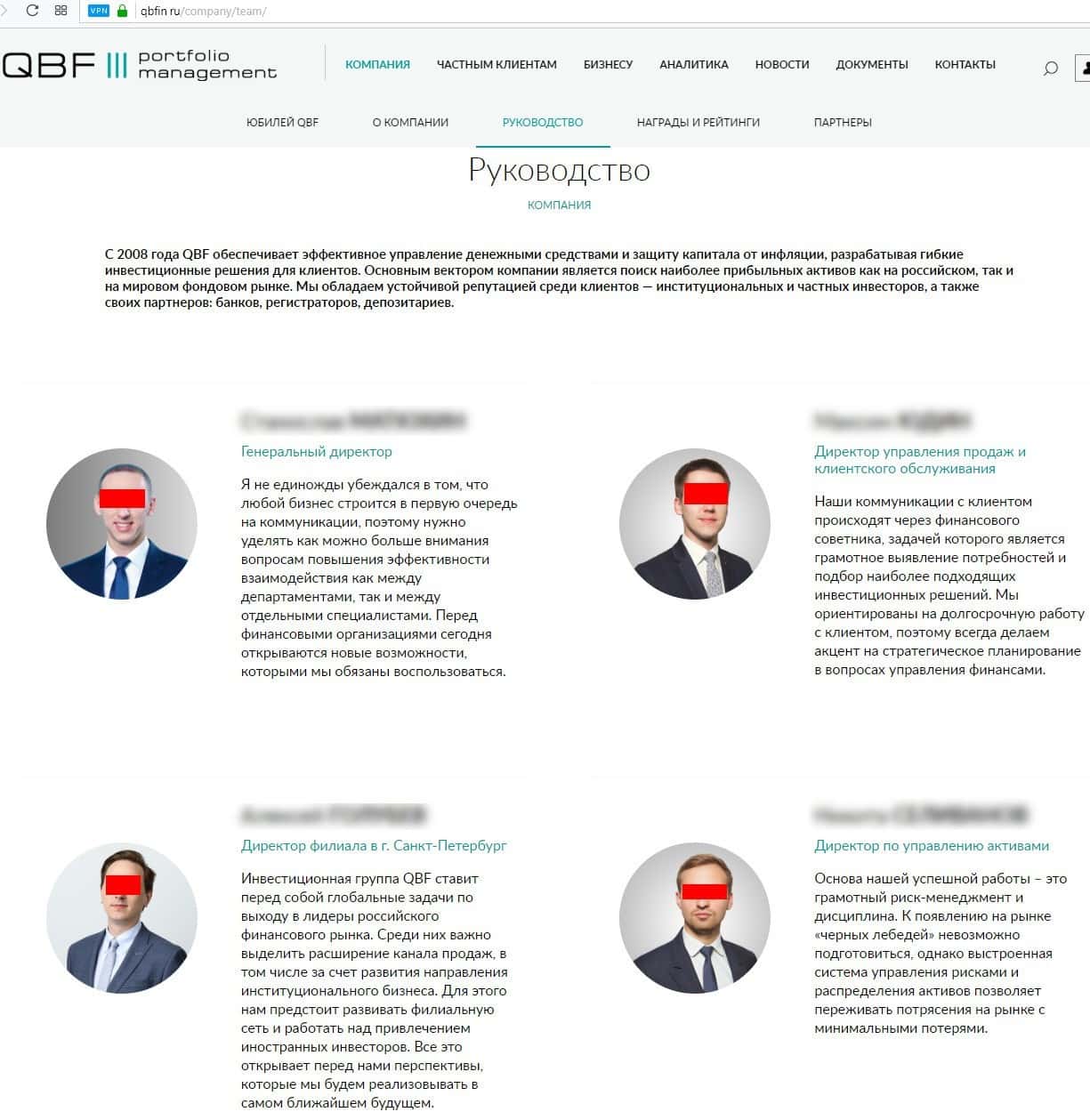 Контора такого масштаба как Кью Б Фин, как она считает, имеет право себя так вести, наверное очень доверяет своей чиновничьей крыше. На их официальном сайте расположена информация о руководителях, которые управляют компанией QB Fin.