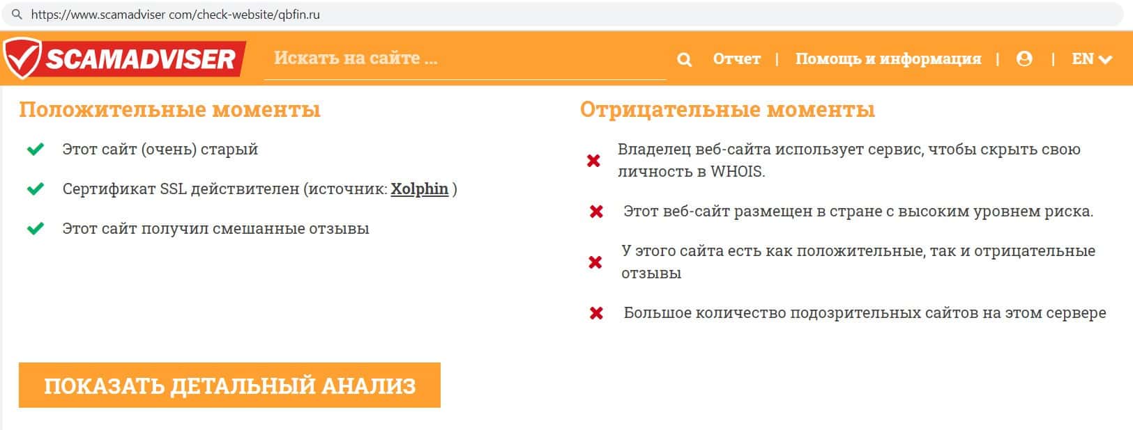 Мы проверили сайт кидал Кью Б Фин через сайт scamadviser com. Выяснилось, что на сайте мошенников очень много подозрительных ссылок, а его владелец скрывает свою личность.