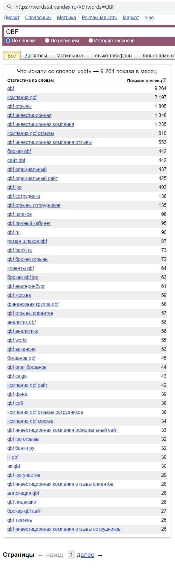 Мы проверили количество запросов компании мошенников QB Fin в Яндексе по названию фирмы, а именно "QBF". Данный запрос пользователи совершили 9264 раза в течении месяца.