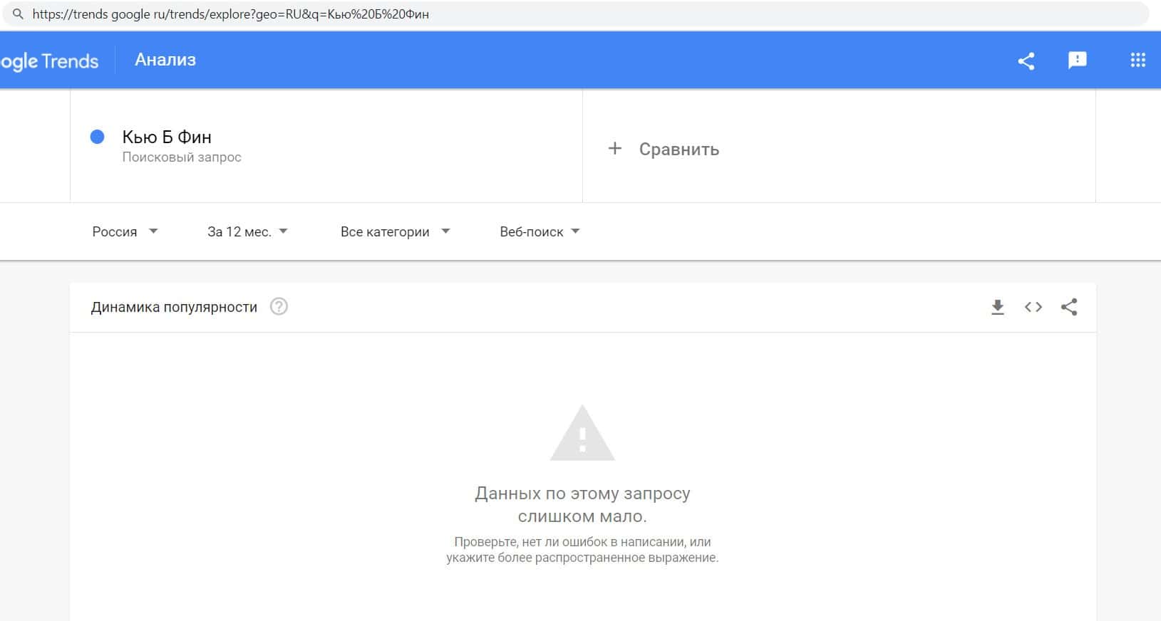 Далее мы проверили количество запросов фирмы аферистов QB Fin по русскоязычному названию конторы, а именно "Кью Б Фин". Данный запрос пользователи не совершали.