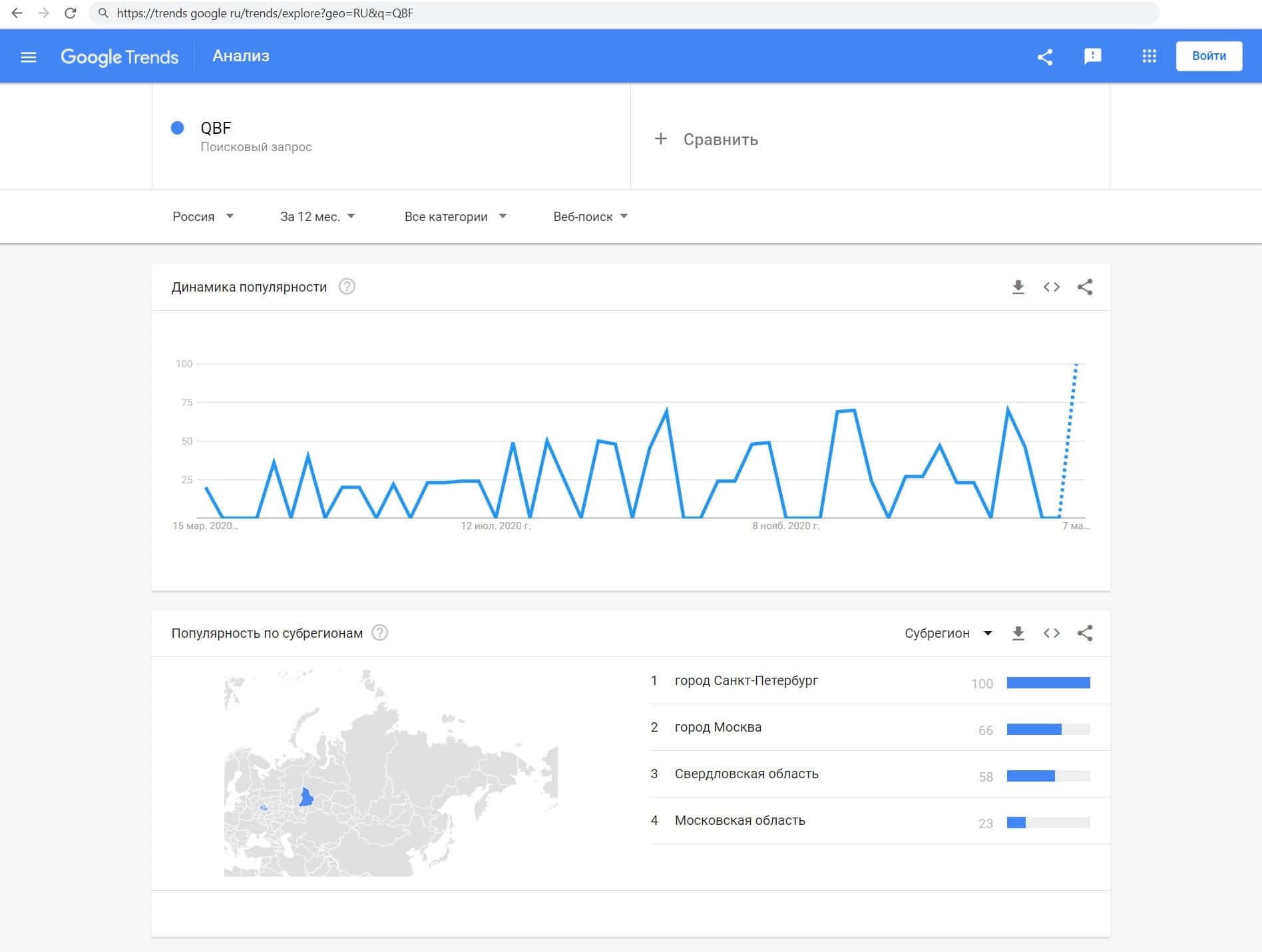 Мы проверили количество запросов фирмы QB Fin в Google по названию компании, а именно "QBF", Данный запрос совершали в основном жители Санкт-Петербурга и Москвы.