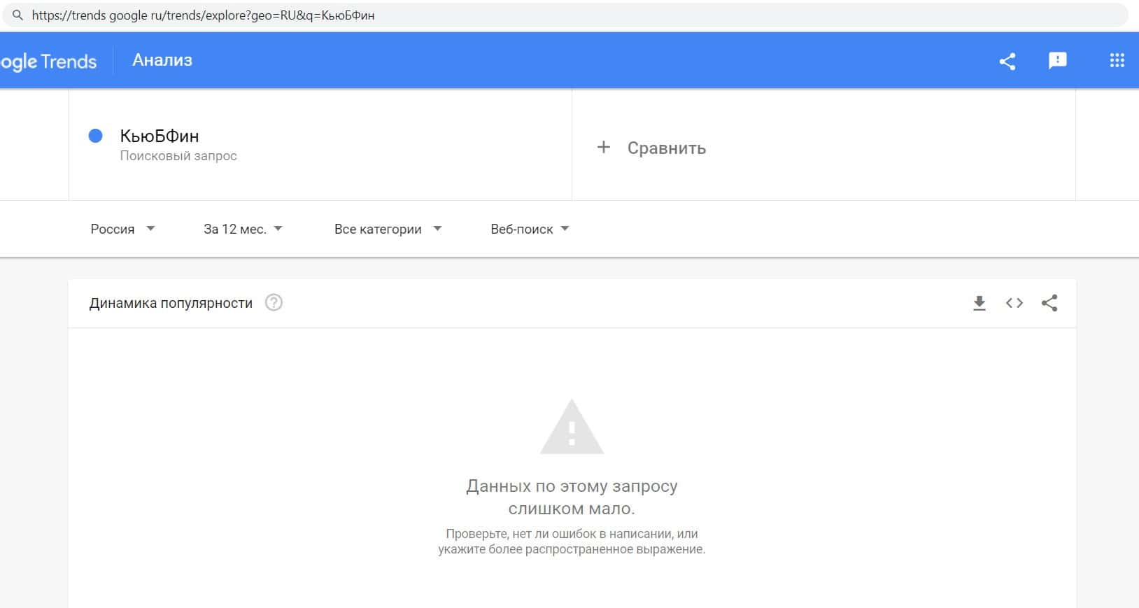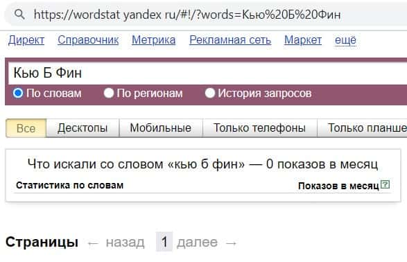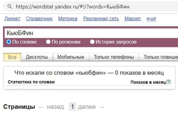 Так же мы проверили количество запросов конторы лохотронщиков Кью Б Фин по русскоязычному названию, но без пробелов, а именно "КьюБФин", но результат - нулевой.