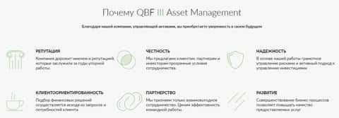 Далее на сайте лохотрона QBFAM следует раздел, в котором аферисты КьюБиЭф Ассет Менеджмент наводят довольно сомнительные преимущества, которые состоят из типичных клишированных мотивационных слов, например те же самые инвестиции в будущее и тому подобные обещания шулеров QBFAM.