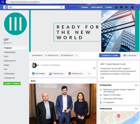 Имеется у шулеров QBFAM и страница в социальной сети Facebook. В ней немного больше подписчиков, чем в предыдущей социальной сети, да активность пользователей совсем низкая. На изображении, расположенном ниже, вы можете увидеть страницу аферистов КьюБиЭф Ассет Менеджмент в социальной сети Фейсбук.