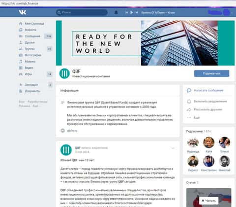 Дабы соответствовать современным трендам и захватить большее количество аудитории аферисты КьюБиЭф Ассет Менеджмент обзавелись страницами в различных социальных сетях, одной из которых стала социальная сеть Вконтакте. На изображении ниже вы можете увидеть группу шулеров QBFAM в социальной сети Вконтакте.