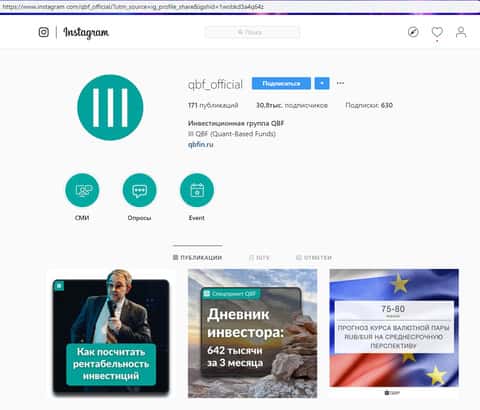 Ну и не поленились проходимцы QBFAM завести страницу в социальной сети Instagram, в которой у мошенников КьюБиЭф Ассет Менеджмент накручено порядка 30ти тысяч подписчиков, потому что активности и отклика аудитории практически нету. На изображении ниже вы можете увидеть страницу жуликов QBFAM в социальной сети Инстаграм.
