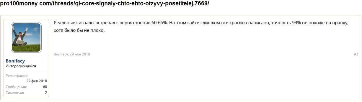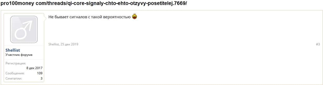 Те, кто профессионально торгуют на валютном рынке, понимают, что вероятность точности сигналов, о которой говорят Кью Ай Коре - это чистой воды разводняк, потому что это в принципе невозможно сделать. Те, кто обещают такую точность, являются разводилами чистой воды и связываться с ними точно не стоит.