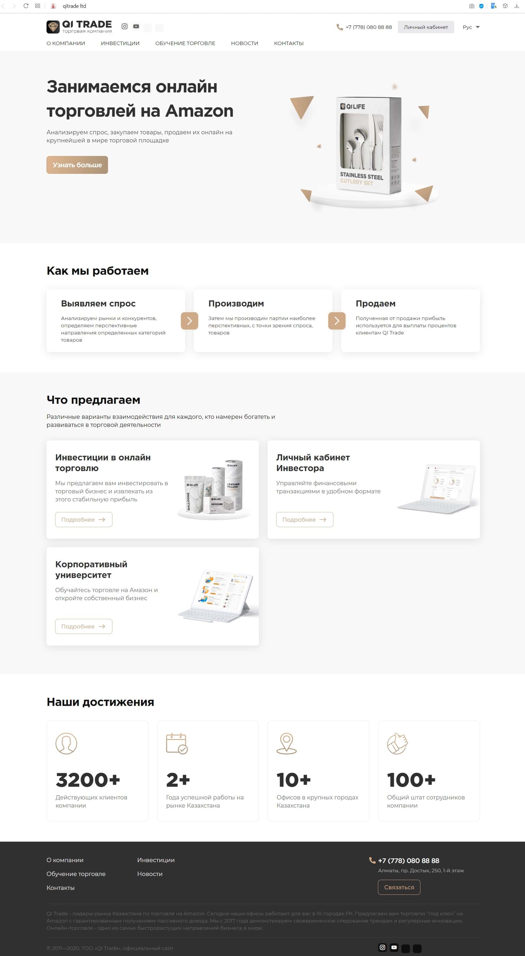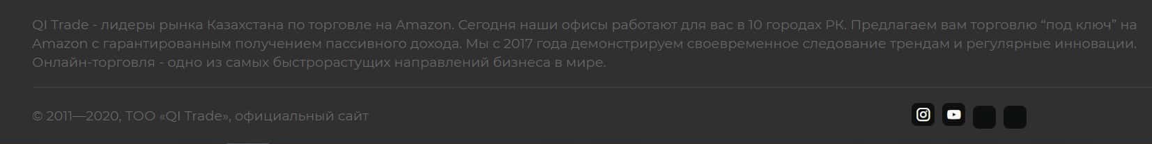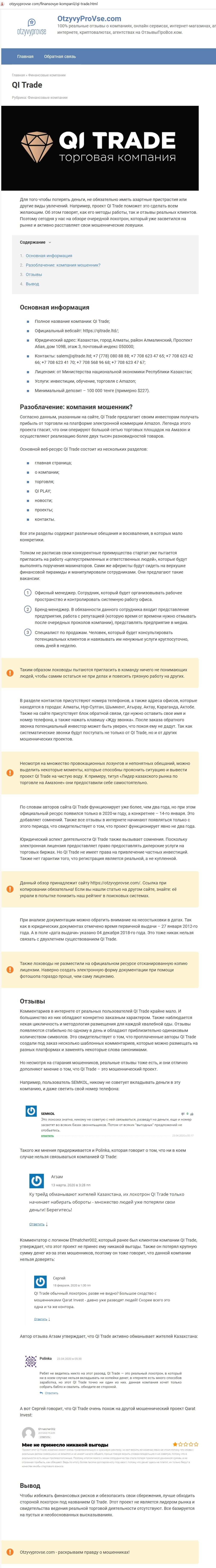 Юридическим лицом компании QITrade Ltd является организация ТОО «QI Trade», о чем написано на главной странице сайта.