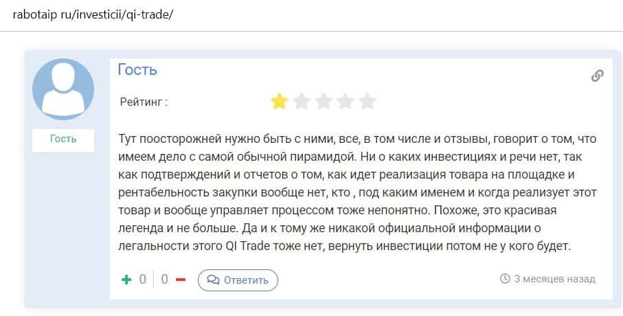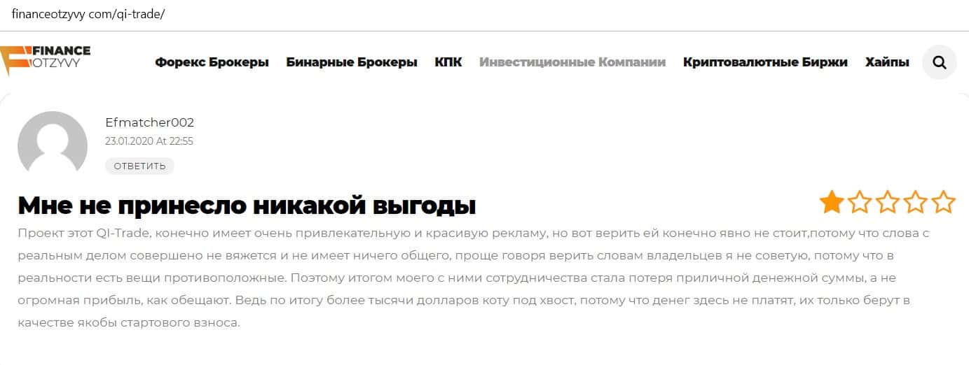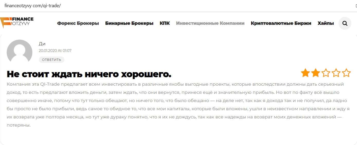 Клиент конторы КьюАй Трейд пишет, что он пытался инвестировать в эту шарашку, но не получил никакого дохода. Мало того, ему еще и не отдают собственные вложения.