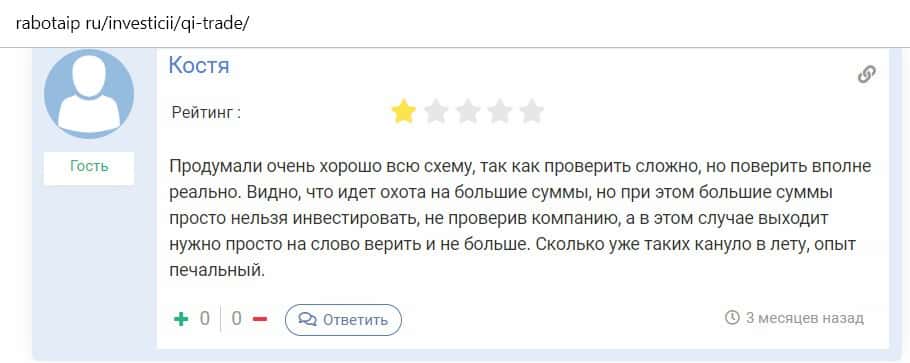 Костя написал отзыв, в котором говорит, что инвестировать большие суммы в такие конторы, как КьюАй Трейд, нельзя, потому что компания не проверенная.